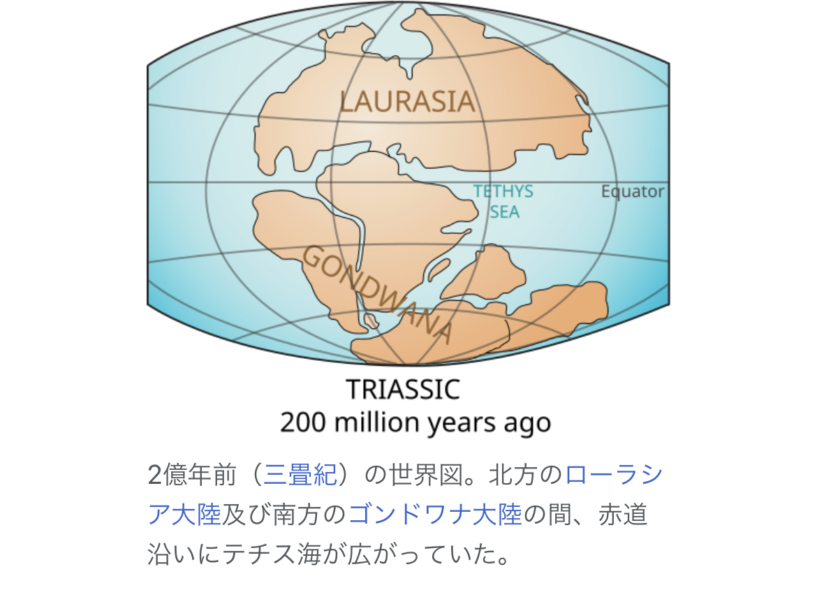 かつてパンゲアという1つの大陸が2億年前から分裂を始めローラシア大陸とゴンドワナ大陸の2つに分かれました。その間に形成されたのがテチス海です。